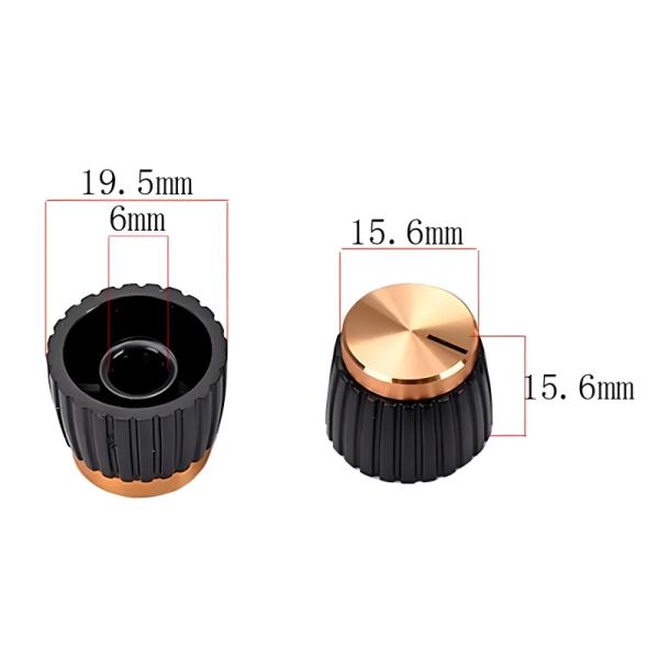 Potentiometer knob, audio knob, ABS material, with copper inlay inside, side screw fastening, and direct insertion installation method. There are two types of outer diameters: 20MM and 16MM, and a height of 16MM with 6.4 and 6MM inner holes. The colors are black gold, white gold, black silver, white silver, black brown, white zongzi, etc